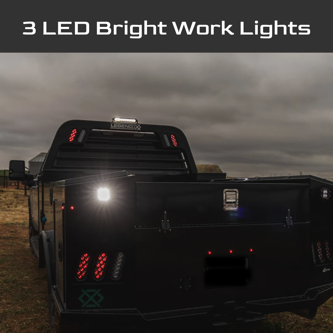 Toilluminate your workspace during those late hours, our truck beds include threeLED bright work lights: one mounted on the headache rack and two on thetailboard. These powerful lights provide the visibility you need to continueworking safely and efficiently, no matter the time of day.