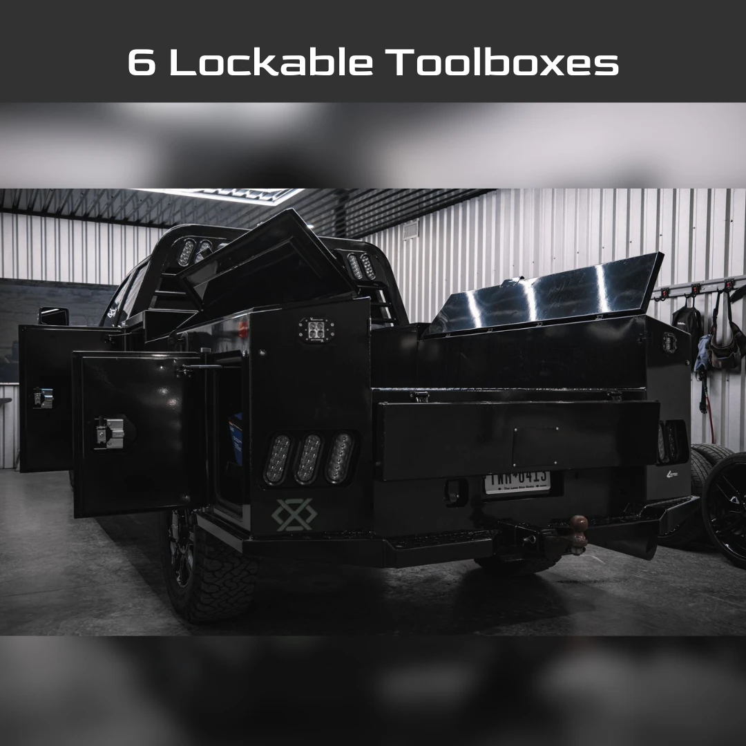 Legend Xtruck beds are outfitted with six secure toolboxes, three on each side, allfeaturing T-handle compression latches for effortless access and security.