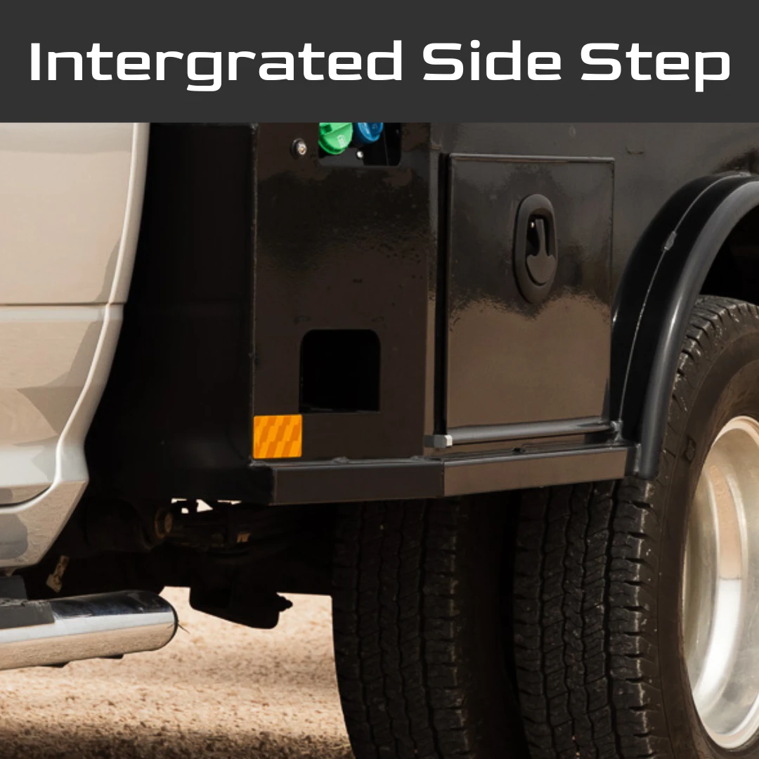 The SD bed comes with 2 verticalcabinets, 2 angled boxes, 2 top boxes, and 2 rear underbody boxes - plus abonus locking rear shovel compartment for tons of storage. Multiple optionchoices allow you to build this bed to your industry. All doors are gas shockequipped and locking paddle latches are standard - as well as a serviceable,tamper-resistant integrated door hinge system. Our 2.5" receiver allowsyou to add a hitch for bumper pull cargo and a 2 5/16" gooseneck ball isstandard in case you are hauling a heavyweight. Our receivers are lab testedand certified for 18,500 lbs bumper capacity and 30,000 lbs gooseneck capacity.Standard adjustable galvanized tool trays with available cabinet tool drawerscan add the finishing touch if you have a lot of parts or tools for yourworkload. Dual LED rear work lights and cast aluminum light housings, as wellas tail gate, are standard features on the SD. These beds are a perfectcomplement for any single or dual wheel work truck with smooth 12 gauge sides,11 gauge bumper and gloss black powder coating.