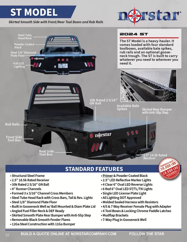 Need aworking truck bed with a little extra built in storage? Our ST skirted truckbed might be just for you. This bed has many features, some of which includefour locking boxes (standard) as well as 10 gauge sides, mated with the 11gauge full skirted bumper. This bed is the perfect fit for any single or dualwheeled work truck and can keep up with your daily workload.