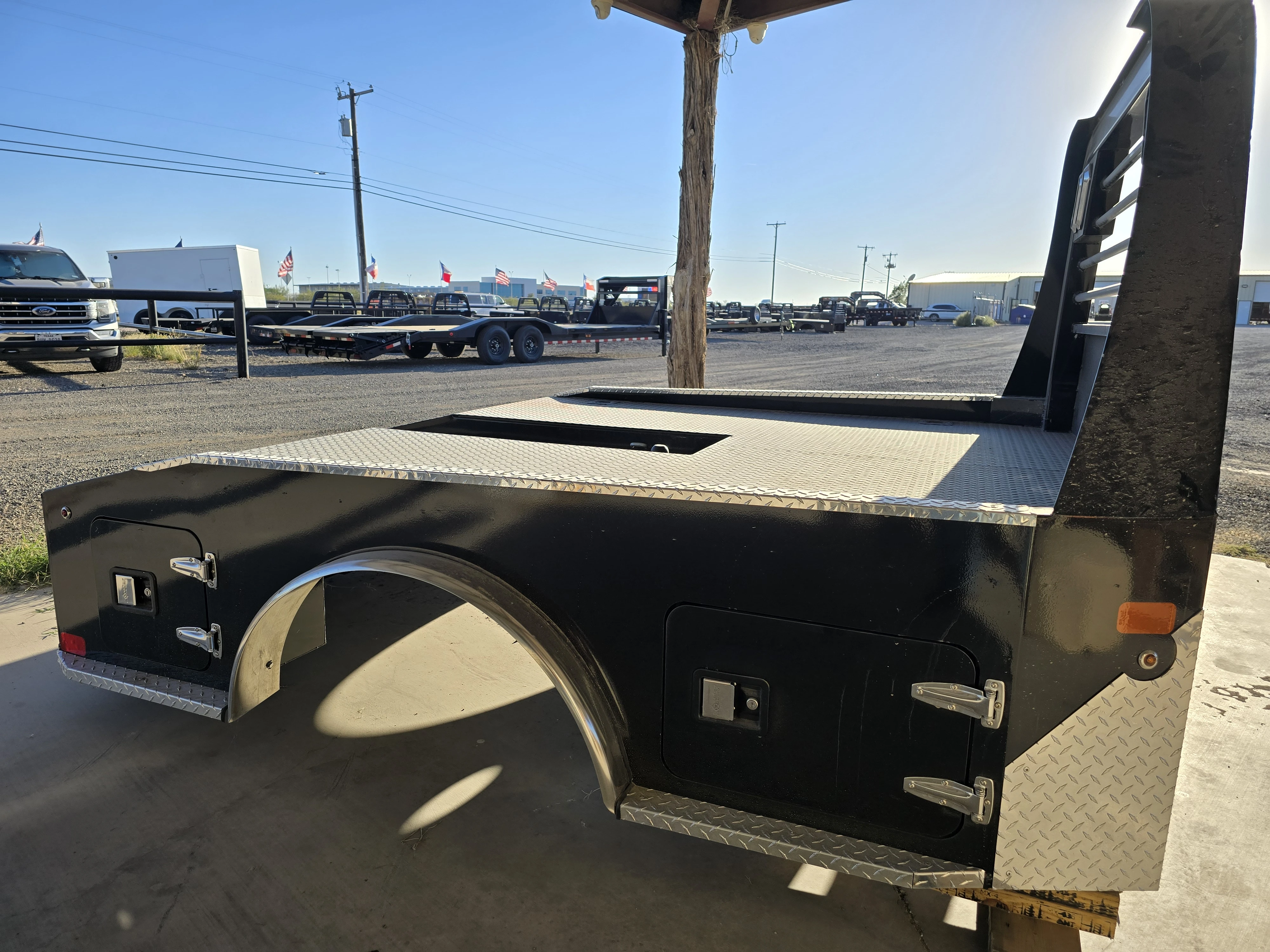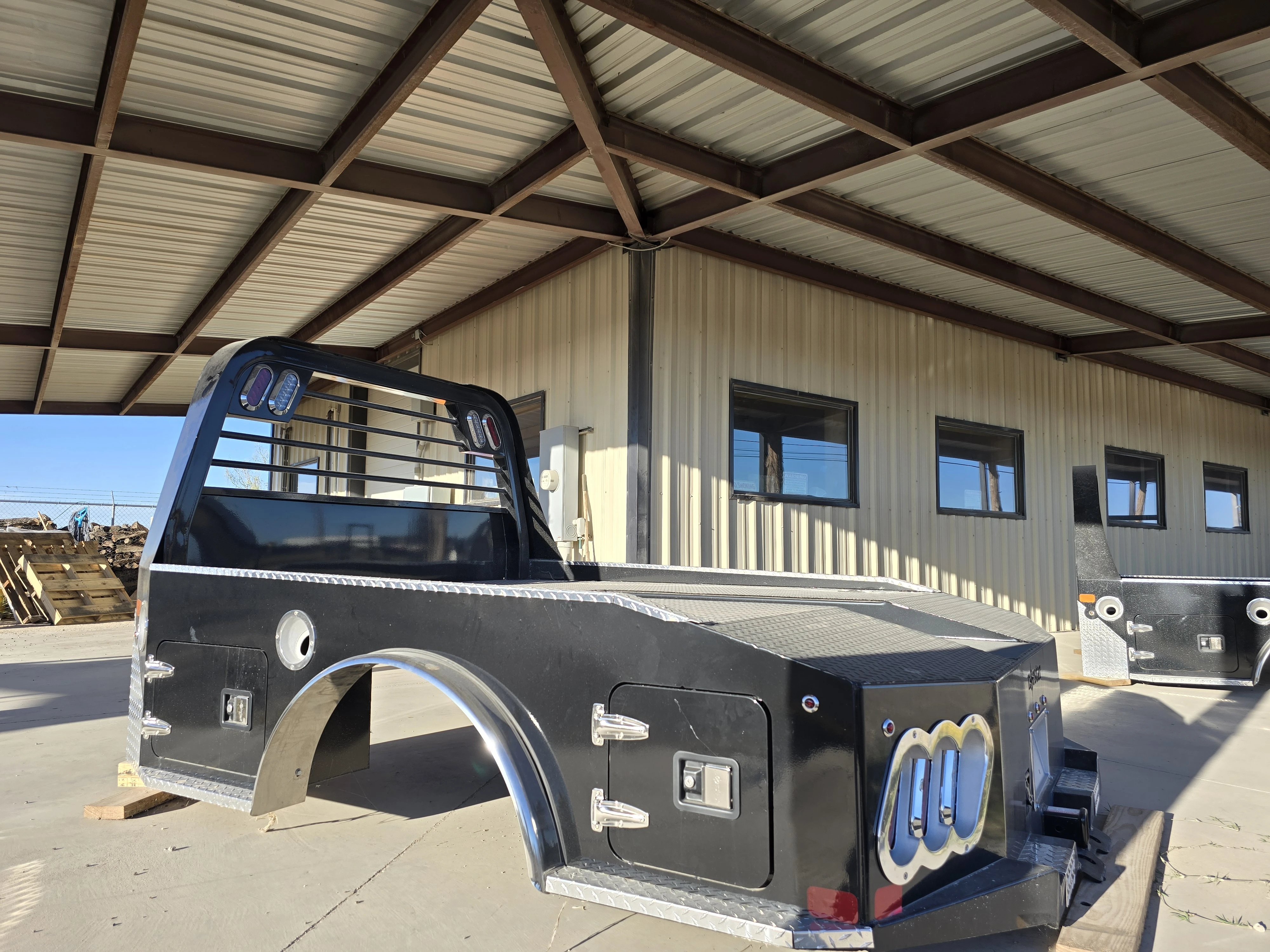 The standard 2.5” receiver allows you to add a hitch for bumper pull cargo and a 2 5/16” gooseneck ball is standard in case you are hauling a heavyweight. Our receivers are lab tested and certified for 18,500 lbs bumper capacity and 30,000 lbs gooseneck capacity. This bed is the perfect fit for any single or dual wheeled work truck and can keep up with your daily workload. The WH comes equipped and ready to impress loaded with 1/8” diamond plate floor and 10 gauge sides, with 11 gauge skirted bumper coated in gloss black powder coat. We have put just about every option on this bed except the kitchen sink – standard including cast housings on rear lighting, fuel filler, license plate mount, chrome accented head rack lighting, running boards and loads of diamond plate trim. Go to work - in style. Dim: 8'6" x 88" CTA 56". Fits: Ford/GMC/Chevy Dually bed takeoff