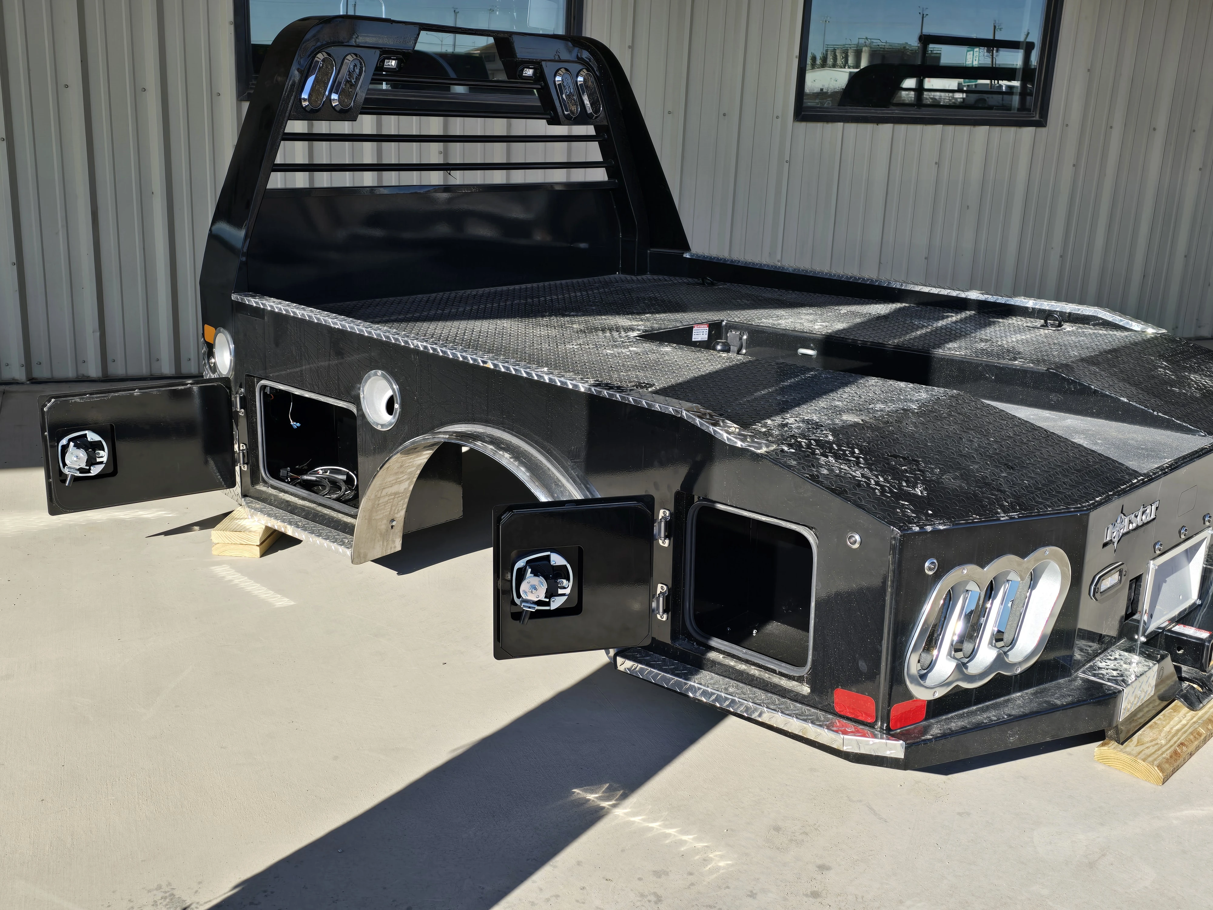 The standard 2.5” receiver allows you to add a hitch for bumper pull cargo and a 2 5/16” gooseneck ball is standard in case you are hauling a heavyweight. Our receivers are lab tested and certified for 18,500 lbs bumper capacity and 30,000 lbs gooseneck capacity. This bed is the perfect fit for any single or dual wheeled work truck and can keep up with your daily workload. The WH comes equipped and ready to impress loaded with 1/8” diamond plate floor and 10 gauge sides, with 11 gauge skirted bumper coated in gloss black powder coat. We have put just about every option on this bed except the kitchen sink – standard including cast housings on rear lighting, fuel filler, license plate mount, chrome accented head rack lighting, running boards and loads of diamond plate trim. Go to work - in style. DIM: 8'6" X 84" CTA 56" - FITS FORD/GMC/CHEVY DUALLY