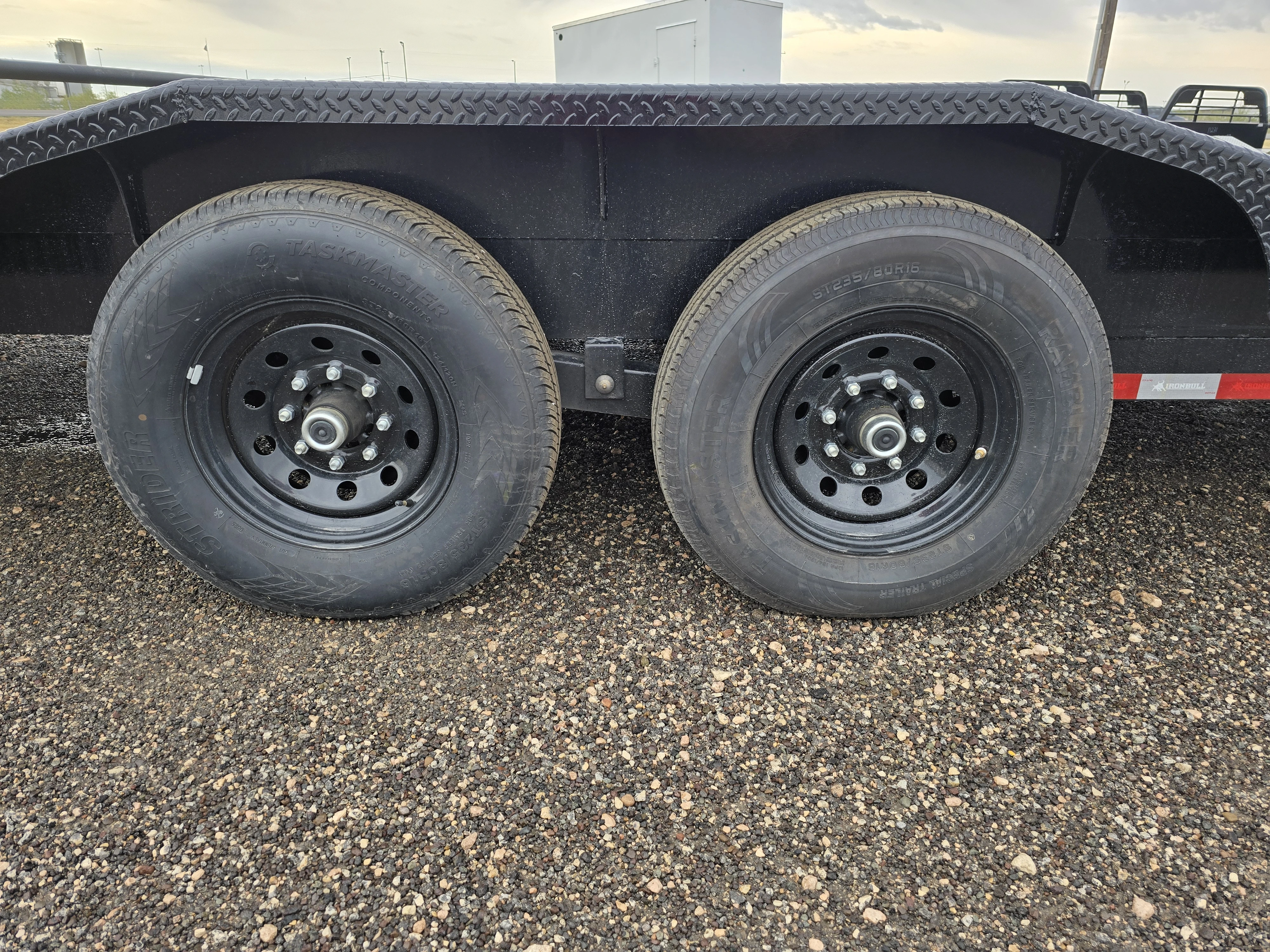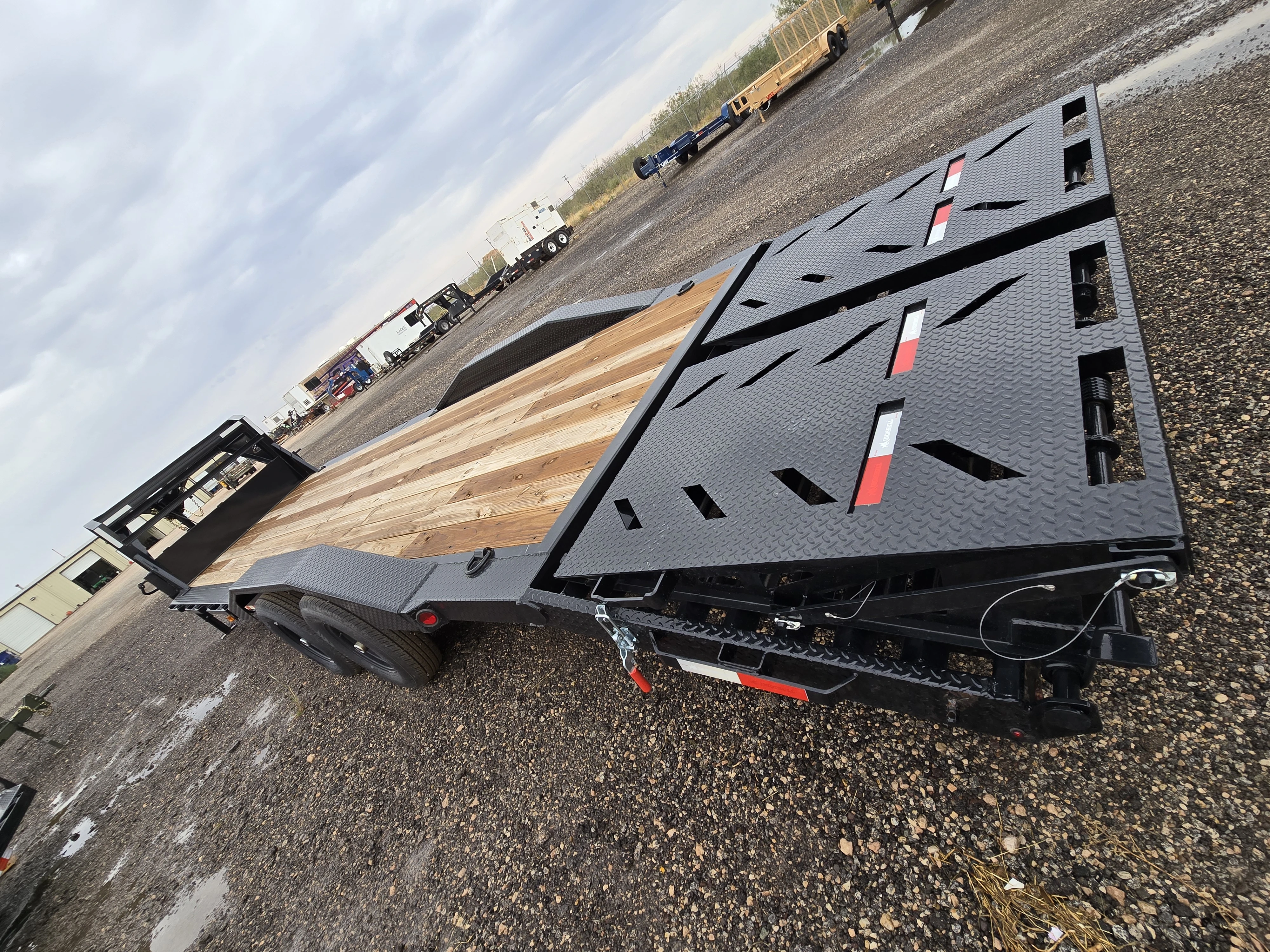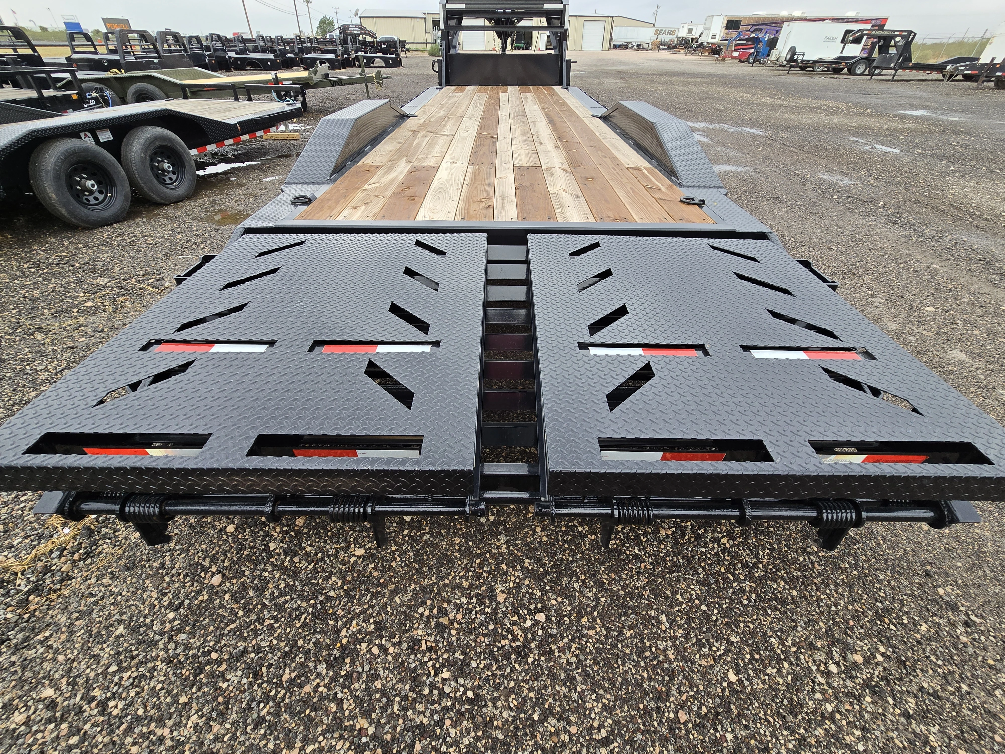 2 - 7,000 Lb Axles Straight (2 Elec. Brakes ). 8" Channel FrameD13 - 102" x 4' Self Cleaning Dove Tail w/ 4' Rampage Ramps. 16" Crossmembers (3" 3.5lb C-channel). 10" I-Beam Neck - Front Full Tool Box Between Neck. Gooseneck Coupler 2-5/16" Adjustable Rd. 25K - Spring Loaded Drop Leg Jack 2-10K - Drive Over Diamond Plate Fenders - Floor (Treated Wood) - Front Bumper (Std.) - Standard Wire Harness - D-Rings 3" x 5/8" Weld On (6ech) Std. - ST235/80 R16 LRE 10 Ply. - Spare Tire Mt. - Black Powder Coat Finish