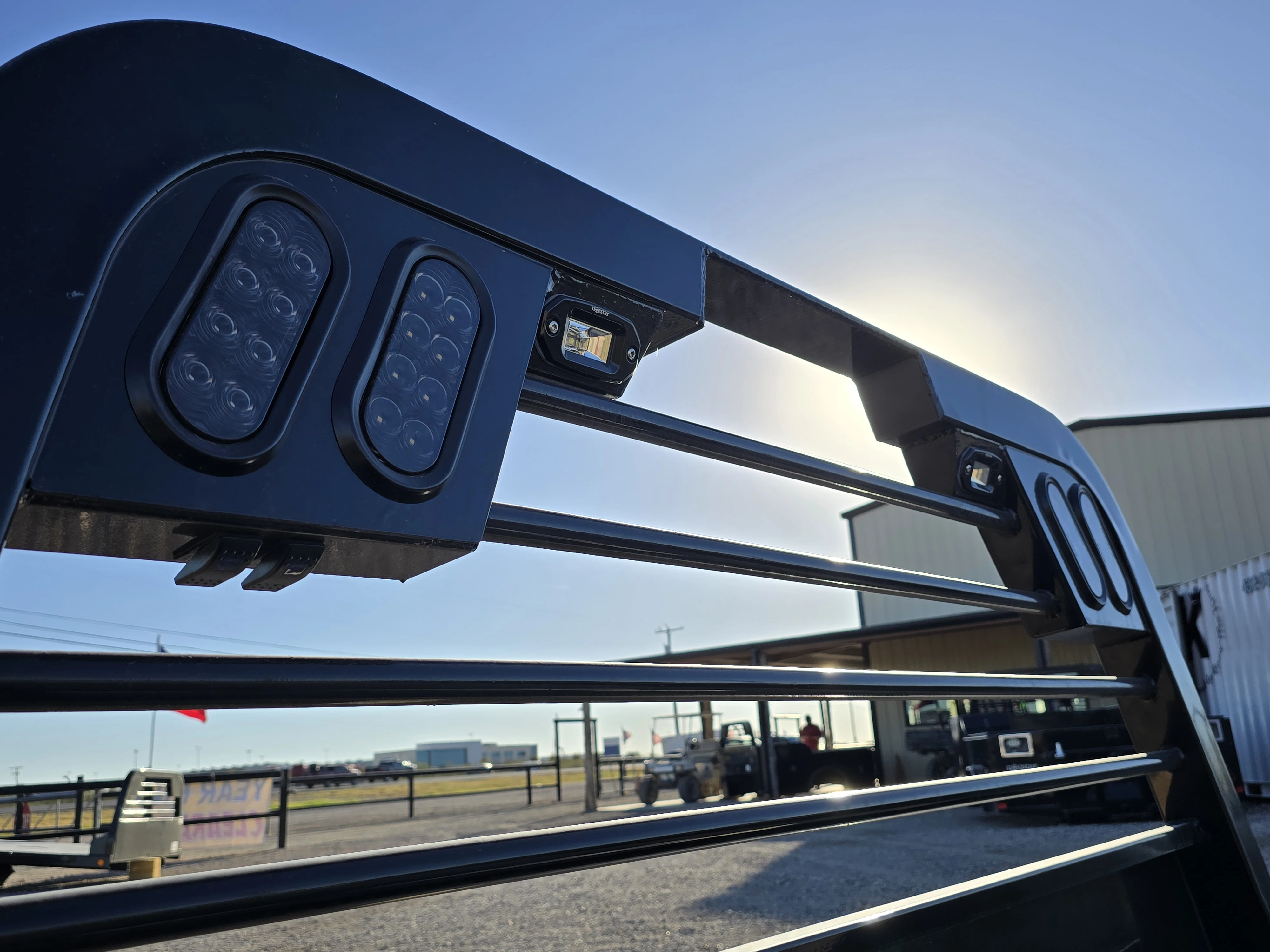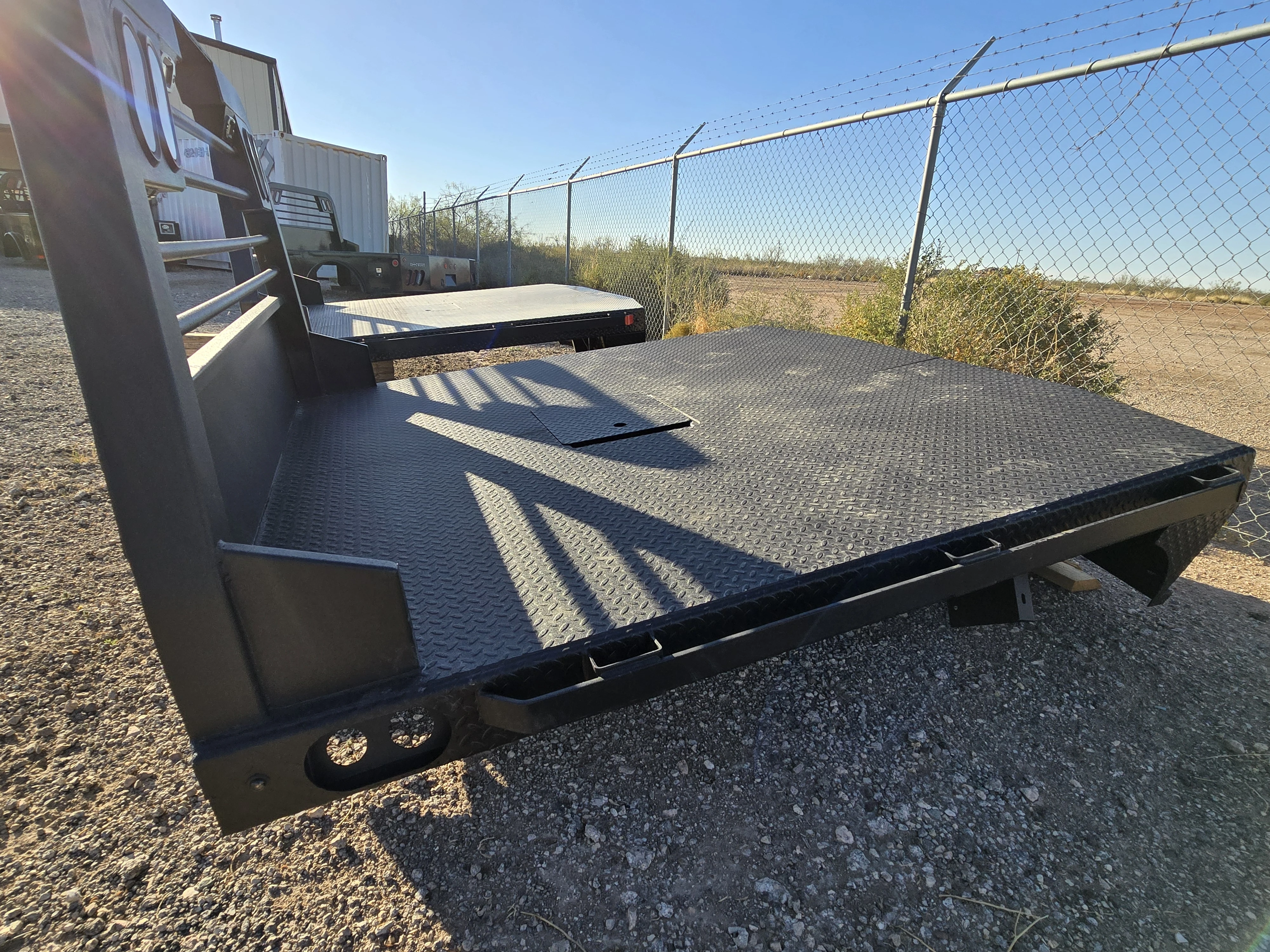 The standard 2.5" receiver allows you to add a hitch for bumper pull cargo and a 2 5/16" gooseneck ball is standard in case you are hauling a heavyweight. Our receivers are lab tested and certified for 18,500 lbs bumper capacity and 30,000 lbs gooseneck capacity. Durable diamond plate construction and powder coat will make this bed your most faithful assistant for years to come. Tapered corners, 7 way plug with 4 way adapter and recessed 2 5/16" ball and receiver hitch give you a towing package standard. Exposed stake pockets and rub rail ensure you have tie down points for any load, plus the LED lights are standard on all SRs. Full 11 gauge skirted rear bumpers finish off every model as an additional standard feature. Dim: 84" x 84" CTA 40". Fits: Ford/Chevy/GMC/Ram Single Wheel Short Bed